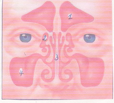 - voorhoofdsholte, 2) zeefbeenholte, 3) neustussenschot, 4) kaakholte